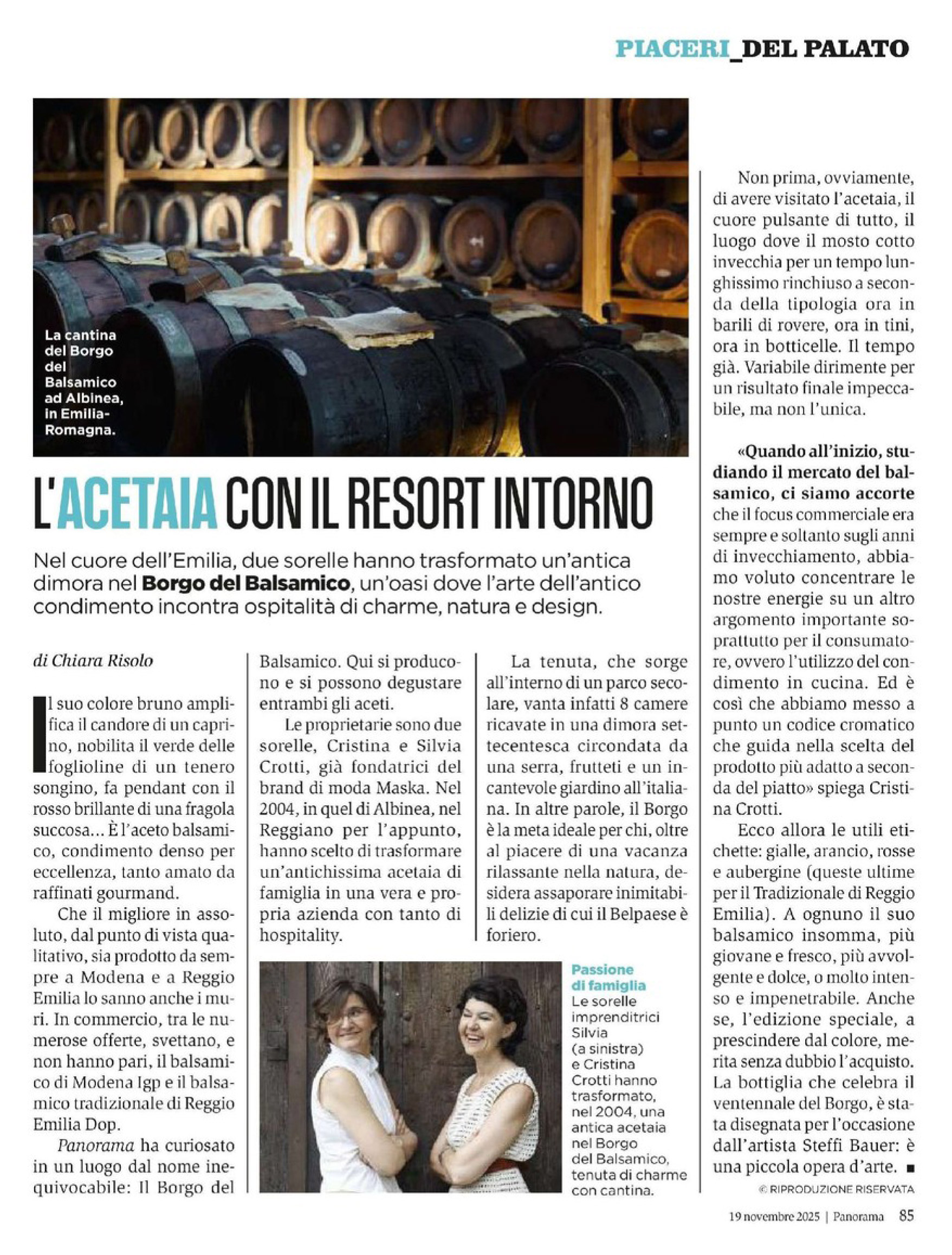 L’articolo ripercorre il percorso delle sorelle Cristina e Silvia Crotti, che hanno trasformato l’antica acetaia di famiglia in un vero e proprio luogo esperienziale: una tenuta immersa in un parco secolare, con camere ricavate in una dimora settecentesca, serre, giardini all’italiana e frutteti, dove è possibile soggiornare, degustare e scoprire da vicino l’arte del balsamico.